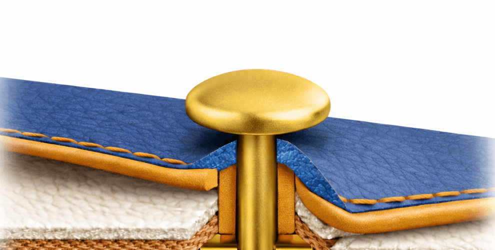 - Le sertissage pour assurer une fixation robuste et uniforme des éléments métalliques (boucles, boutons-pression, œillets). (Poste 195)
